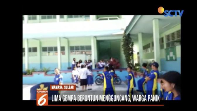 Liputan6.com, Mamasa - Lima gempa beruntun yang terjadi hanya dalam selisih beberapa menit, menguncang Mamasa, Sulawesi Barat, Rabu siang tadi. Warga yang sedang beraktivitas berhamburan keluar berupaya menyelamatkan diri.
