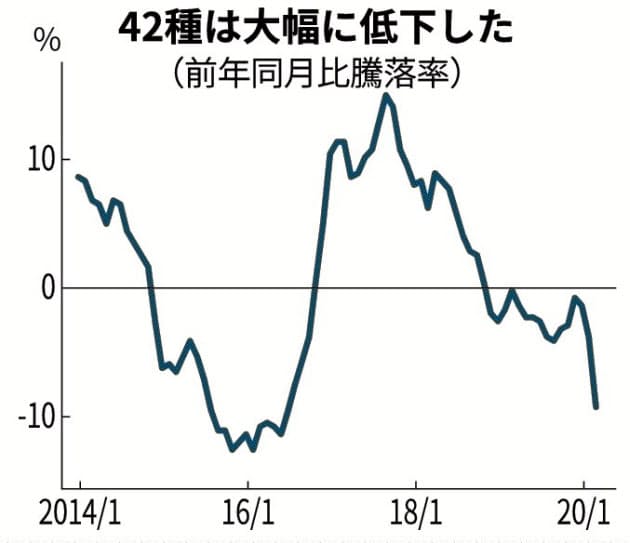 景気動向に敏感な資材や燃料の企業間取引価格をもとに算出した日経商品指数42種(1970年=100)は3月末値が166.195となり、前年同月比17.437ポイント(9.5%)低下した。前年同月比での低下は16カ月連続。新型コロナウイルスの世界的な感染拡大でヒトやモノの移動が制限されるなか、需要が急激に縮小。低下幅を広げている。