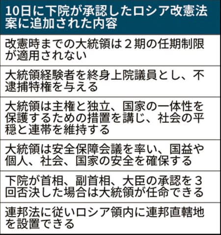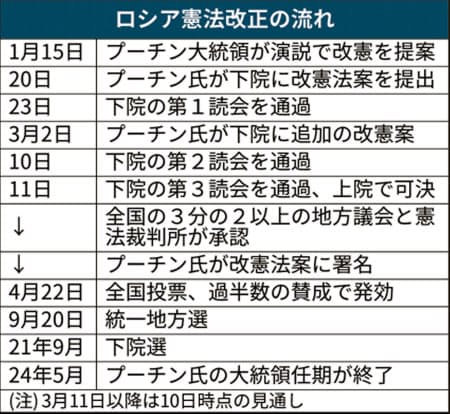 改憲法案は下院、上院の可決後、地方議会の承認などを経て、4月22日の全国投票で一括して賛否を問う。投票者の過半数の賛成で発効する。2024年のプーチン氏の任期切れをにらみ、体制移行を円滑に進める狙いとされていたが、基本承認された改憲法案では、プーチン氏の24年以降の続投が可能になった。