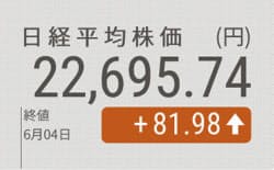 4日の東京株式市場で日経平均株価は4日続伸した。前日比81円98銭(0.36%)高の2万2695円74銭で終え、2月21日(2万3386円)以来およそ3カ月半ぶりの高値を付けた。米経済指標の改善を受けて景気回復期待が高まり、前日の米株式市場で主要3指数がそろって上昇。リスクオンムードが世界で広がるなか、円相場が円安・ドル高に振れたこともあって、景気に敏感な主力株に買いが入った。もっとも日経平均は先週から今週にかけて2000円以上水準を切り上げており、利益確定売りが出て、下げに転じる場面もあった。