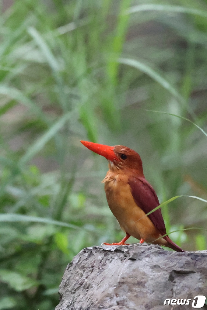 (경주=뉴스1) 최창호 기자 = 29일 오후 경북 경주시 안강읍 옥산서원 숲 속에 둥지를 튼 호반새 한마리가 둥지에 있는 새끼들에게 먹잇감을 구하기 위해 주변을 살피고 있다. 멸종위기관심대상종인 호반새는 파랑새목 물총새과로 6~7월사이 5~6개의 알을 낳는다. 2020.6.29/뉴스1