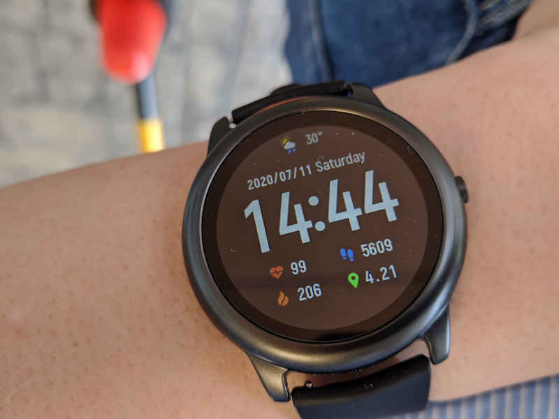 竜頭に似せた、トグルスイッチがひとつ。これとスクリーンのタップ、スワイプで『Haylou Solar LS05』を操作します。画面サイズは、1.28インチ。スマートウォッチによくあるOLEDではなくTFT液晶ディスプレイです。とはいえ、バックライトがかなり明るいのか、ある程度明るい昼間でも問題なく盤面を読めます。