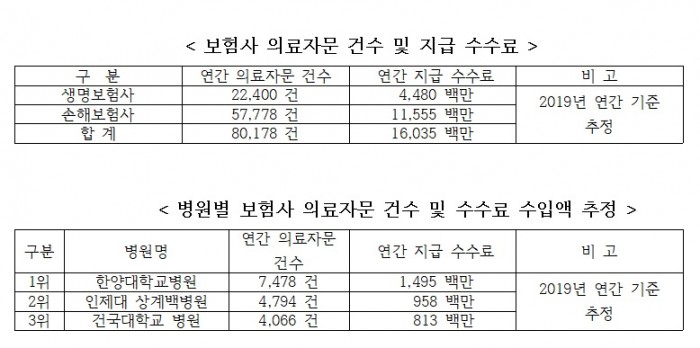 지난해 하반기 보험사 의료자문 현황을 분석한 결과, 보험사들은 연간 8만건의 소견서를 보험사 자문의에게 의뢰했고, 이들에게 의료자문료 명목으로 연간 160억원 정도를 지급하는 한편 의료자문 건수가 가장 많은 병원은 한양대학교병원으로 모든 생명보험사와 손해보험사의 자문을 통해 연간 7500여 건이 넘는 소견서를 발급하며 15억원의 자문료를 받은 것으로 나타났으며, 인제대 상계백병원과 건국대학교병원 등이 뒤를 이었다.