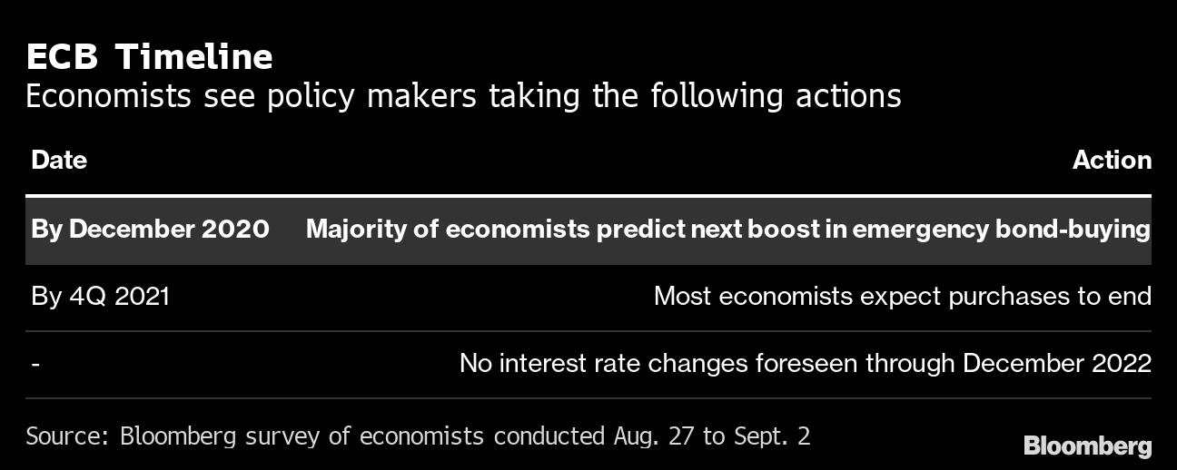 ブルームバーグの調査に答えたエコノミストの大半は、ECBが1兆3500億ユーロ(約170兆円)のパンデミック緊急購入プログラム(PEPP)の規模を12月までに拡大すると予想した。予想中央値では3500億ユーロの拡大が見込まれている。