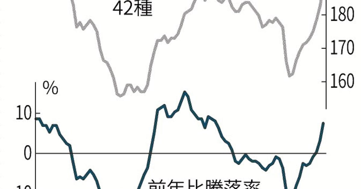 景気動向に敏感な資材や燃料の企業間取引価格を基に算出する日経商品指数42種(1970年=100)は2月末値が188.433と、前年同月比12.628ポイント(7.2%)上昇した。前年同月比プラスは2カ月連続。世界経済の回復期待や足元の堅調な輸出・生産を支えに、幅広い商品が値上がりしたことを映した。