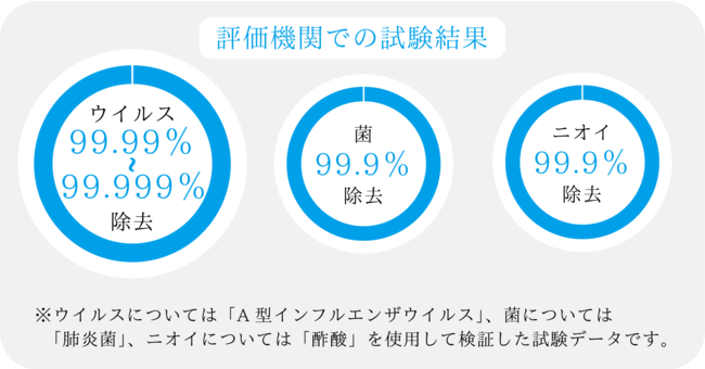 評価機関にて、ウイルス99.99〜99.999%・菌99.9%・ニオイ99.9%の除去を実証済。