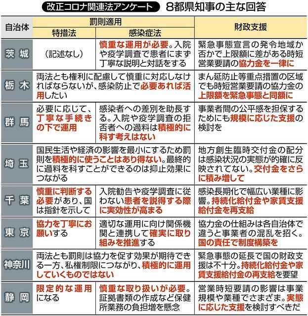 アンケートでは、東京都と神奈川、埼玉、千葉、茨城、栃木、群馬、静岡の各県知事に、罰則などに関する考えを聞いた。