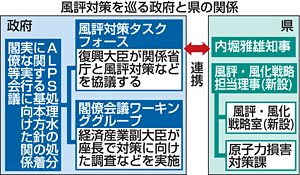 幹部会合は、政府方針の着実な実行に向けた関係閣僚会議(実行会議)が新設する作業部会(ワーキンググループ)と連携し、風評を抑制するための具体策を検討する。県も28日付で部長級の「風評・風化戦略担当理事」、企画調整課内に「風評・風化戦略室」を新設、庁内の司令塔機能や国との折衝機能の強化を図ることにしており、内堀知事は会談で「タスクフォースの中身が問われる。県も組織体制を強化し、しっかり連携していく」と述べた。